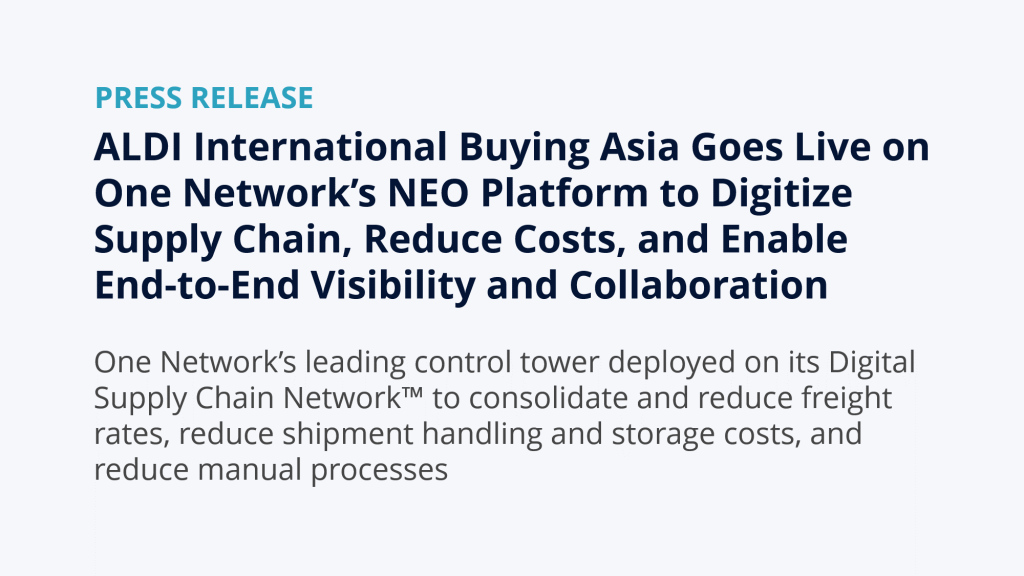 Dallas, TX, January 4, 2024 – One Network Enterprises (ONE), the leading global provider of intelligent control towers and the Digital Supply Chain Network™, is pleased to announce that ALDI International Buying Asia is live with ONE’s Intelligent Control Tower on the Digital Supply Chain Network™. This helps ALDI improve its logistics operations by centralizing global shipping volume, increasing cost transparency, and improving its control over the movement of goods throughout the supply chain. This enables ALDI to develop a strategic ocean freight procurement strategy to better manage their global shipments of goods.