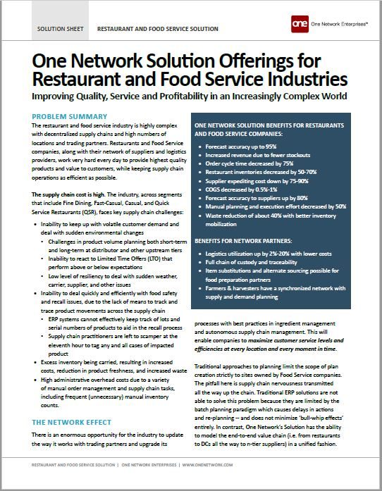 Learn how One Network’s industry leading platform brings resiliency, efficiency, and shared business benefits for restaurants and food service companies and their rich ecosystem of suppliers, distributors, and logistics providers. Restaurants can dramatically improve service levels and deliver the highest quality product for the best possible customer experience – while at the same time cutting restaurant inventories in half, providing accurate forecasts to partners, reducing waste, and lowering supply chain expenses.
