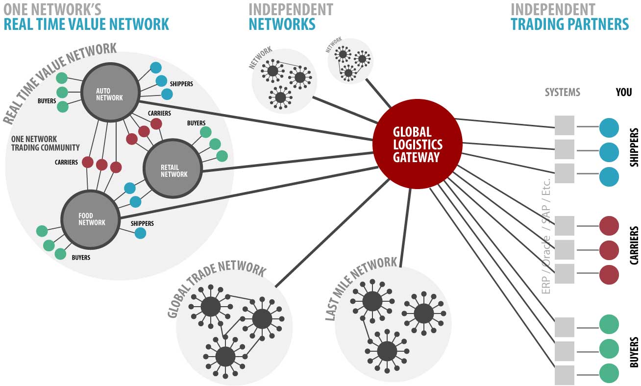The Global Logistics Gateway enables Carriers, Freight Forwarders, Orchestrators, Distributors, Custom Brokers and Suppliers to execute the global fulfillment and transportation process via a single access point. The Gateway connects with business networks for sales, procurement, freight, and logistics services, to create a ubiquitous network of networks at global scale. The Gateway supports interoperability between supply chain operating networks through open standards-based authentication, and public API-based process orchestration, to any buy/sell system or any transport management system (TMS).